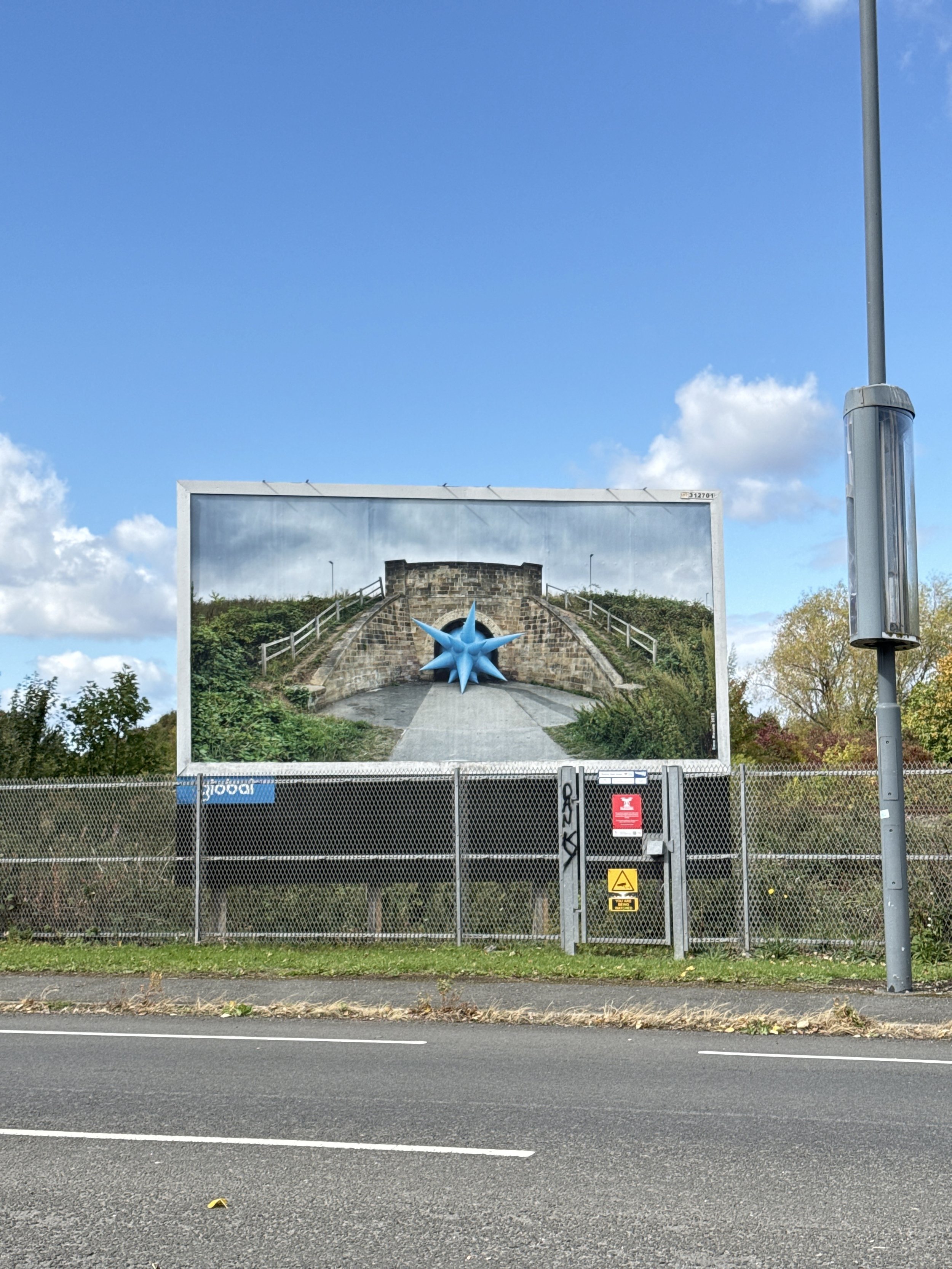 As the locations are mostly on difficult to access land, and often on private property, it wasn’t possible for the public to see the pieces in situ. Instead they were documented in large format photography and will be displayed in public on billboards. The billboards chosen are beside the current railway line from Bishop Aukland to Middlesbrough to make a visual connection with passing trains. Being alongside busy roads the large photos will be seen by thousands of people daily. Taking a hidden part of the story and making it very visual for a few weeks.