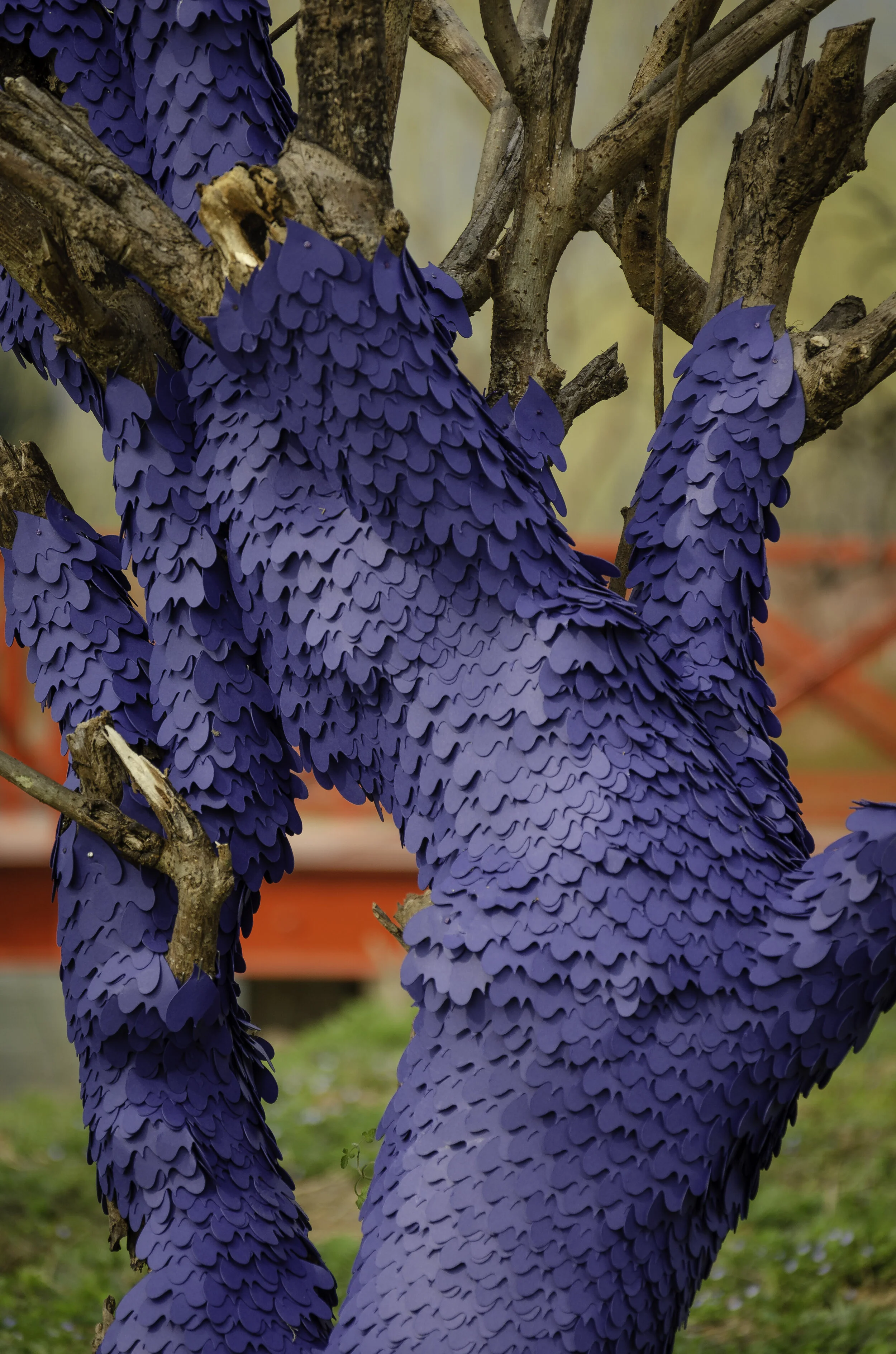 Part of an ongoing series of environmental and site-responsive pieces for Cumbria-based paper manufacturer, James Cropper Speciality Papers. This indoor piece was created for Luxe Pack trade show in Shanghai. 'Cortex' is a twisted mountain tree clothed in 5,300 pieces of die-cut paper. The piece was inspired by an Alexander McQueen design. The individual pieces cling to the surface of the tree and accentuate the curves and contours like a second skin. Made from 'Azurite Blue' paper stock, the folds and turns in the piece form a myriad of shades around the main colour.